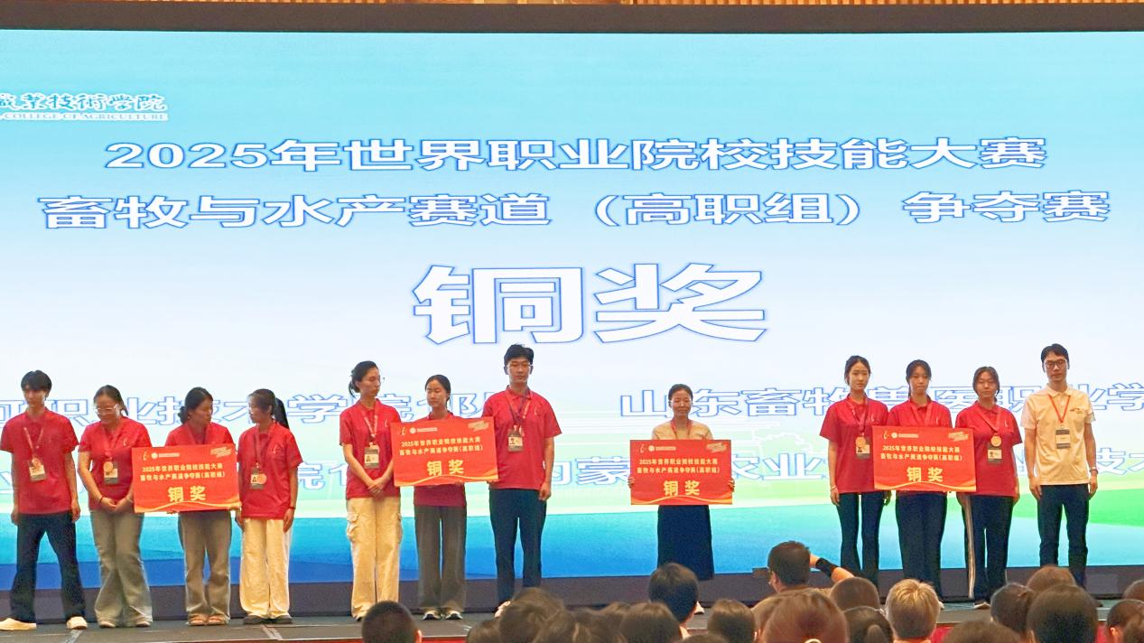 8月22日,2025年世界职业院校技能大赛“畜牧与水产”赛道总决赛争夺赛(高职组)在福建农业职业技术学院圆满落幕。经过激烈角逐,我院畜牧兽医技术系王兆彤、宋子琪、杜嘉颖(指导教师:贾俊涛、郭凤英)凭借扎实的专业功底、娴熟的实操技能与稳定的临场发挥,从来自全国103支参赛队伍中脱颖而出,最终斩获铜奖,展现了高职畜牧兽医专业学子的过硬实力与职业风采。