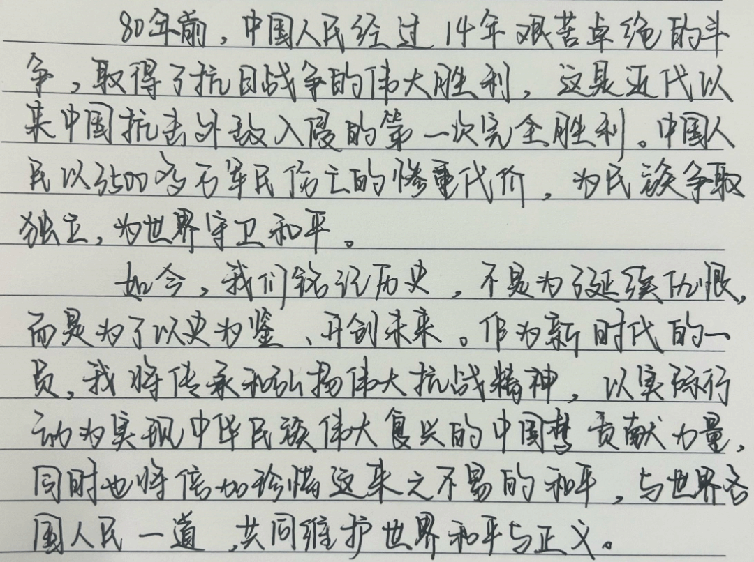 食品工程技术系25级食品科学与工程食教专升本5班高颖在观后感这样写道,80年前,中国人民经过14年艰苦卓绝的斗争,取得了抗日战争的伟大胜利,这是近代以来中国抗击外敌入侵的第一次完全胜利。中国人民以3500多万军民伤亡的惨重代价,为民族争取独立,为世界守卫和平。如今,我们铭记历史,不是为了延续仇恨,而是为了以史为鉴、开创未来。作为新时代的一员,我将传承和弘扬伟大抗战精神,以实际行动为实现中华民族伟大复兴的中国梦贡献力量,同时也将倍加珍惜这来之不易的和平,与世界各国人民一道,共同维护世界和平与正义。