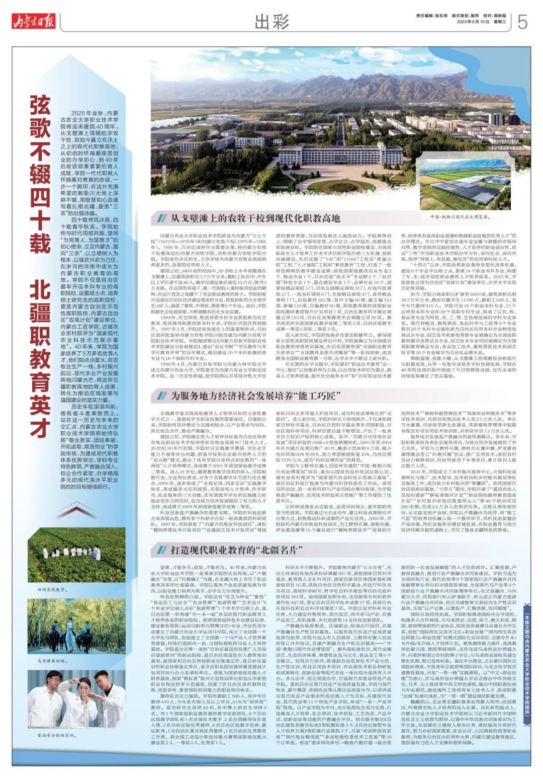 2025年金秋,内蒙古农业大学职业技术学院将迎来建院40周年。从戈壁滩上简陋的农牧干校,到如今矗立在沃土之上的现代化职教高地;从初创时怀揣着艰苦创业的办学初心,到40年后收获硕果累累的育人成就,学院一代代职教人怀揣着对教育的赤诚,一步一个脚印,在这片充满希望的敕勒川大地上深耕不辍,用智慧和心血谱写着扎根北疆、服务“三农”的壮丽诗篇。