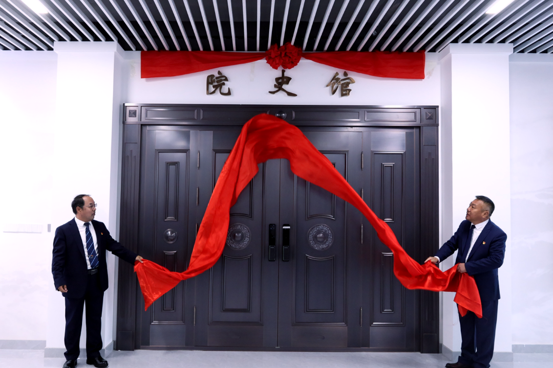 校党委委员、学院党委书记韩瑞平与那森巴雅尔共同为院史馆揭牌。随着红绸的缓缓落下,标志着院史馆正式向公众开放,开启了学院历史传承与文化传播的新篇章。
