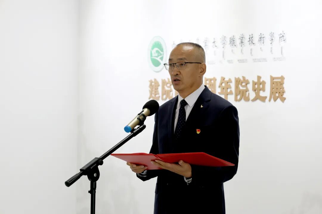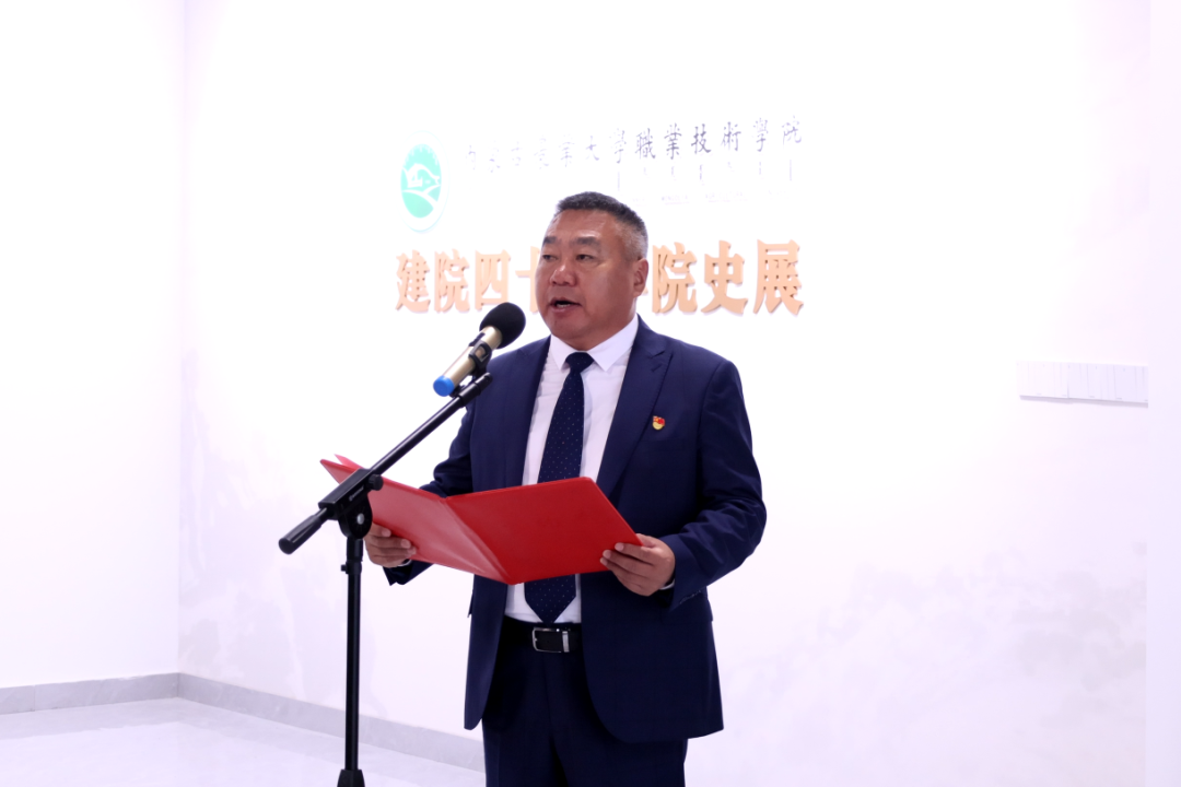 校党委委员、学院党委副书记、院长那森巴雅尔在致辞中表示,院史馆的落成是学院发展史上的一座重要里程碑,它既是回望来时路,扎根北疆、薪火相传的激荡;也是立足当下,深耕沃土、勇担使命的责任担当;更是展望未来,凝心聚力、共创辉煌的方向指引。院史馆内陈列的一张张照片、一件件实物、一段段故事,是对峥嵘岁月的深情回望,更是对“敬业务实、团结奉献、开拓进取、艰苦创业”学院传统的永恒铭记。
