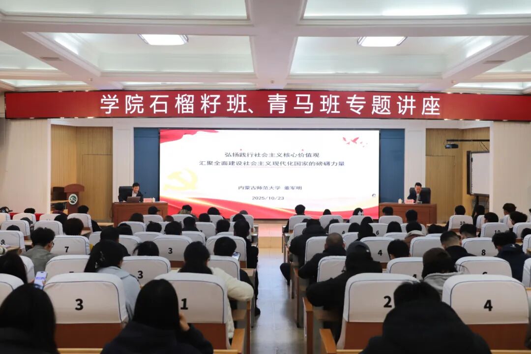 10月23日上午,学院石榴籽班、第十期青年马克思主义者培养工程大学生骨干培训班专题讲座在图书馆报告厅开讲,邀请内蒙古师范大学马克思主义学院教授、马克思主义理论研究所所长董军明老师担任主讲嘉宾,讲座由学院团委书记董智勇主持。