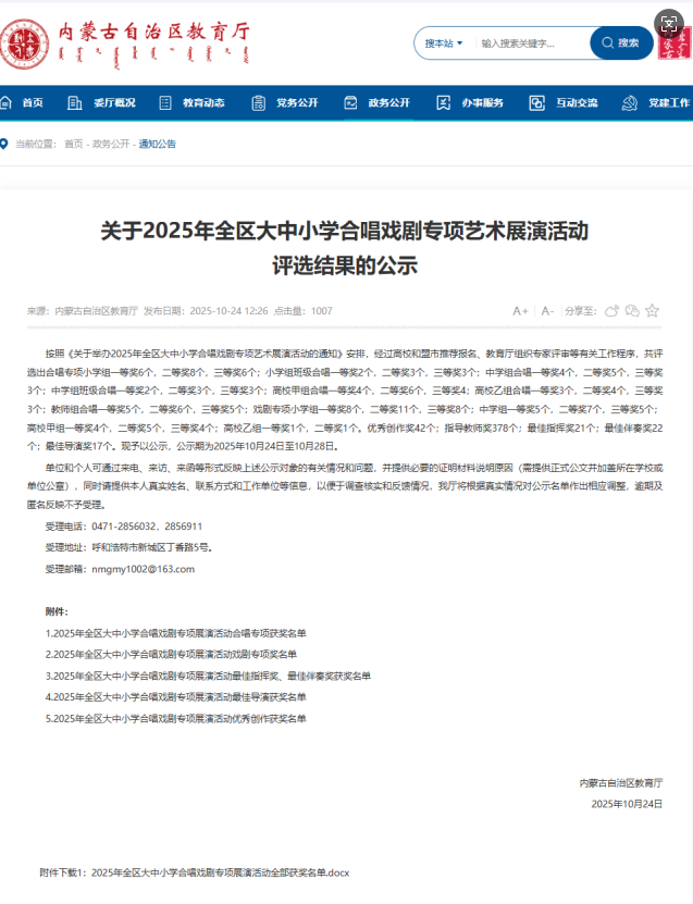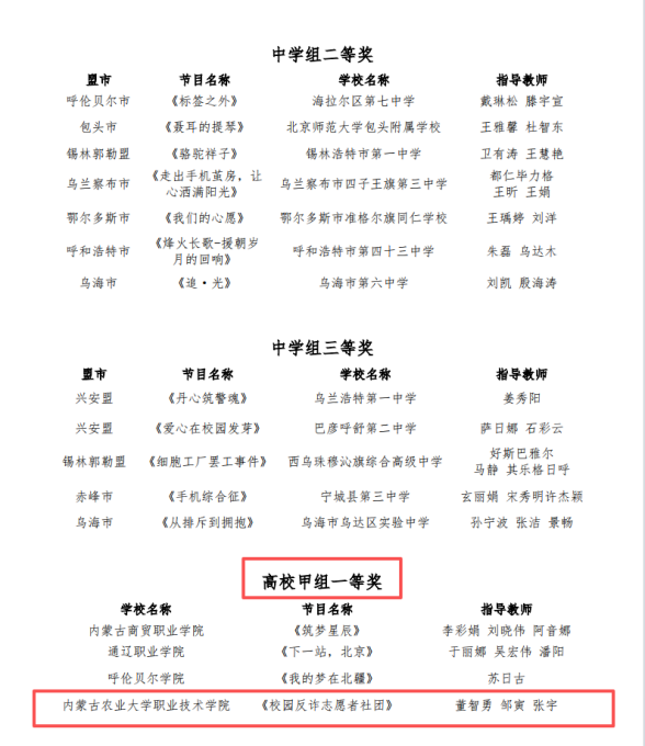 10月30日至11月4日,2025年全区大中小学合唱、戏剧专项艺术展演活动于鄂尔多斯市举办。我院选送的戏剧作品《校园反诈志愿者社团》荣获戏剧专项类高校甲组一等奖。