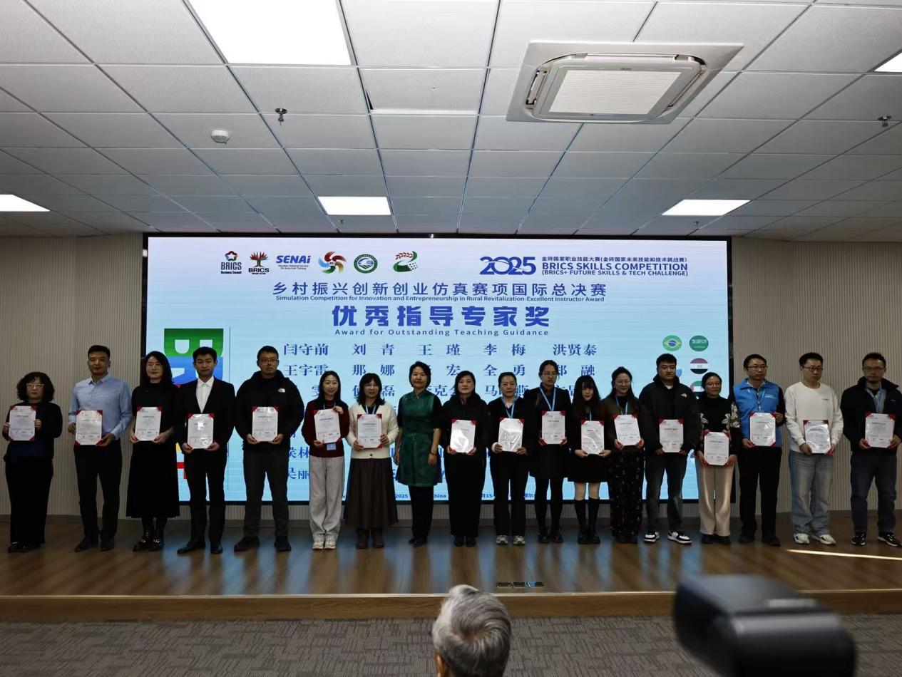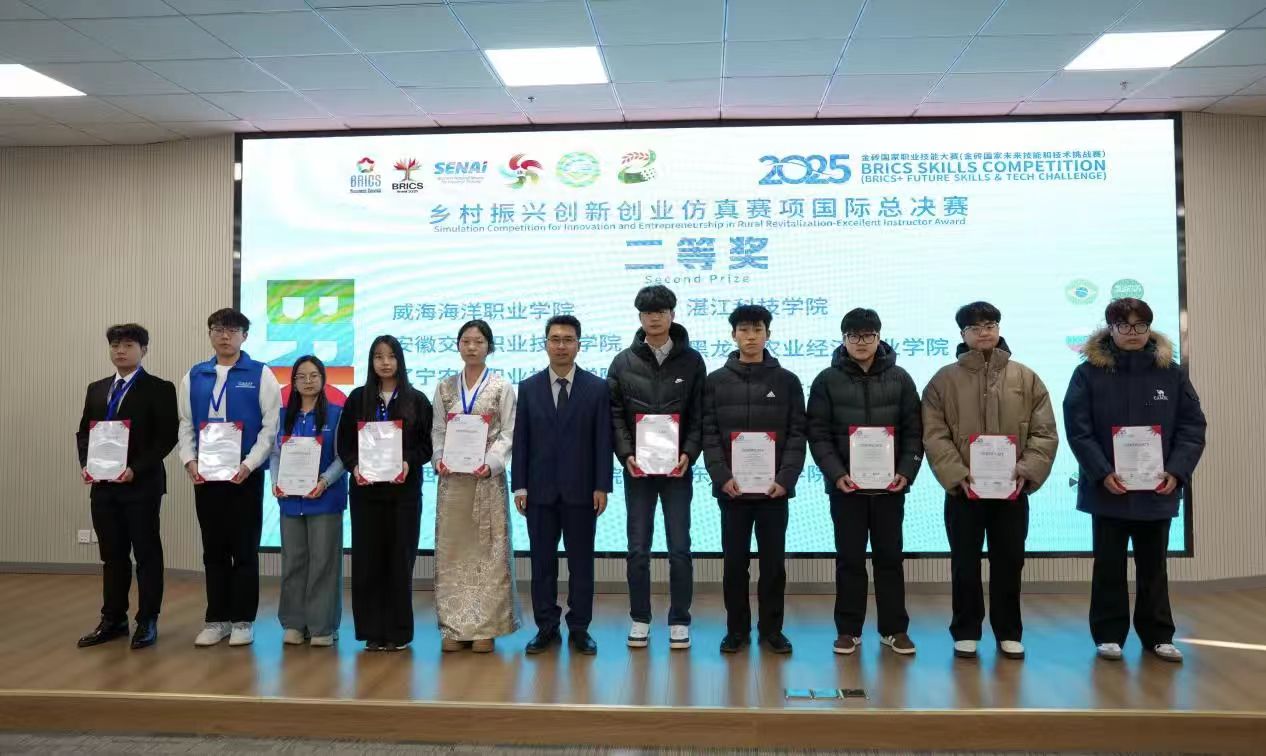 11月15日至17日,2025金砖国家职业技能大赛乡村振兴创新创业仿真赛项国际总决赛在鄂尔多斯生态环境职业学院顺利举行。本次大赛共有来自国内外的58支队伍同台竞技,其中10支为国际参赛队,48支为国内参赛队,竞争激烈。我院经济管理系工商管理专业学生张毓青、石曜瑄、苏新雅组成的竞赛团队,聚焦家庭农场经营管理核心技能,融合思政教育、政策解读与风险防控等多元内容,发挥专业特长,最终荣获大赛二等奖,指导教师刘荣君、吴丽娜获评“优秀指导专家奖”。