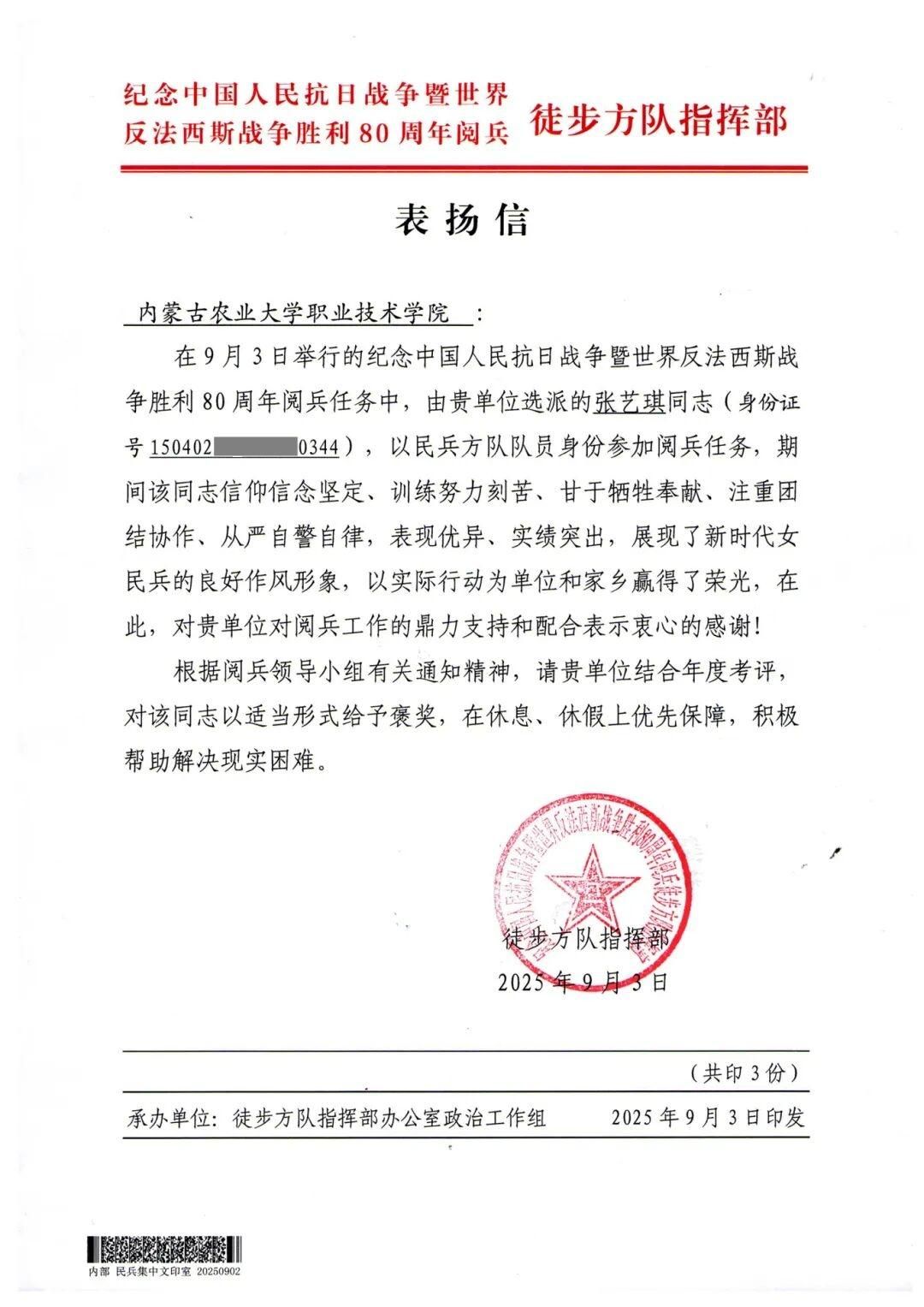 11月27日,我院收到来自纪念中国人民抗日战争暨世界反法西斯战争胜利80周年阅兵徒步方队指挥部表扬信,对我院学子张艺琪在9月3日举行的纪念中国人民抗日战争暨世界反法西斯战争胜利80周年阅兵任务中的工作给予了充分的认可,对学院的鼎力支持和配合表示衷心的感谢。