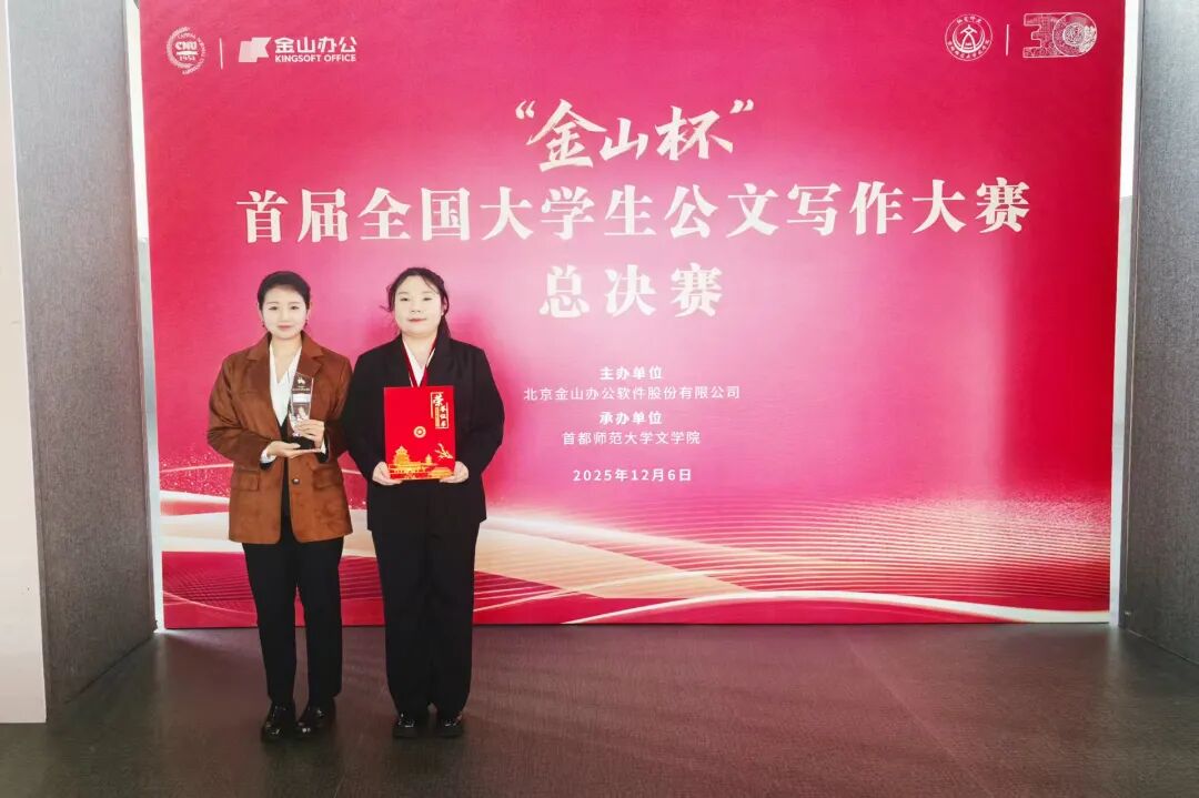 12月6日,由北京金山办公软件股份有限公司联合首都师范大学文学院等院校共同主办的首届“金山杯”公文写作大赛总决赛正式落下帷幕。我院马克思主义学院23级现代文秘专业马丽娜、张敏同学凭借过硬的专业积累和出色的临场表现,在激烈角逐中脱颖而出,荣获大赛银奖。