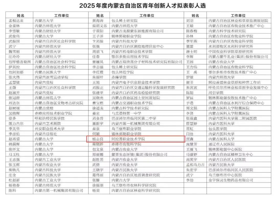 近日,自治区两项重要人才评选结果相继揭晓,学院优秀校友科右前旗惠牧农牧业专业合作社理事长李永强荣膺“2025年全区新时代青年先锋奖”;同期,阿拉善职业技术学院教师杨志良荣获“2025年自治区青年创新人才”称号。两位校友在截然不同的领域深耕不辍,以卓越的贡献诠释了新时代青年的责任、创新与担当,为学院赢得了广泛的社会声誉。