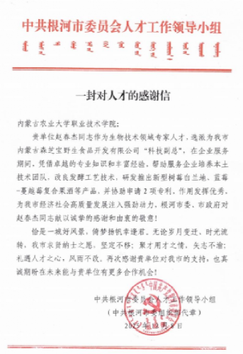 近日,我院收到来自中共根河市委员会人才工作领导小组的感谢信,对学院食品工程技术系赵春杰同志在根河市企业服务期间的突出贡献给予充分认可,对学院的大力支持和人才选派工作表示衷心的感谢。