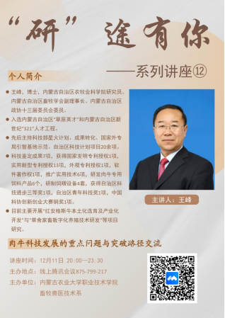 12月11日晚,畜牧兽医技术系邀请内蒙古自治区农牧业科学院研究员王峰为全体教师作线上科研专题讲座,会议由畜牧兽医技术系副主任曹晓娟主持。