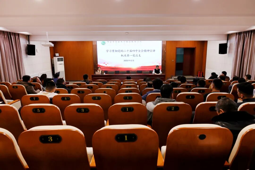 12月30日,机关第一党总支在科技报告厅举办学习贯彻党的二十届四中全会精神宣讲会。会议特邀马克思主义学院郑传慧作专题辅导报告,党总支全体党员参加学习。宣讲会由机关第一党总支书记高宏伟主持。