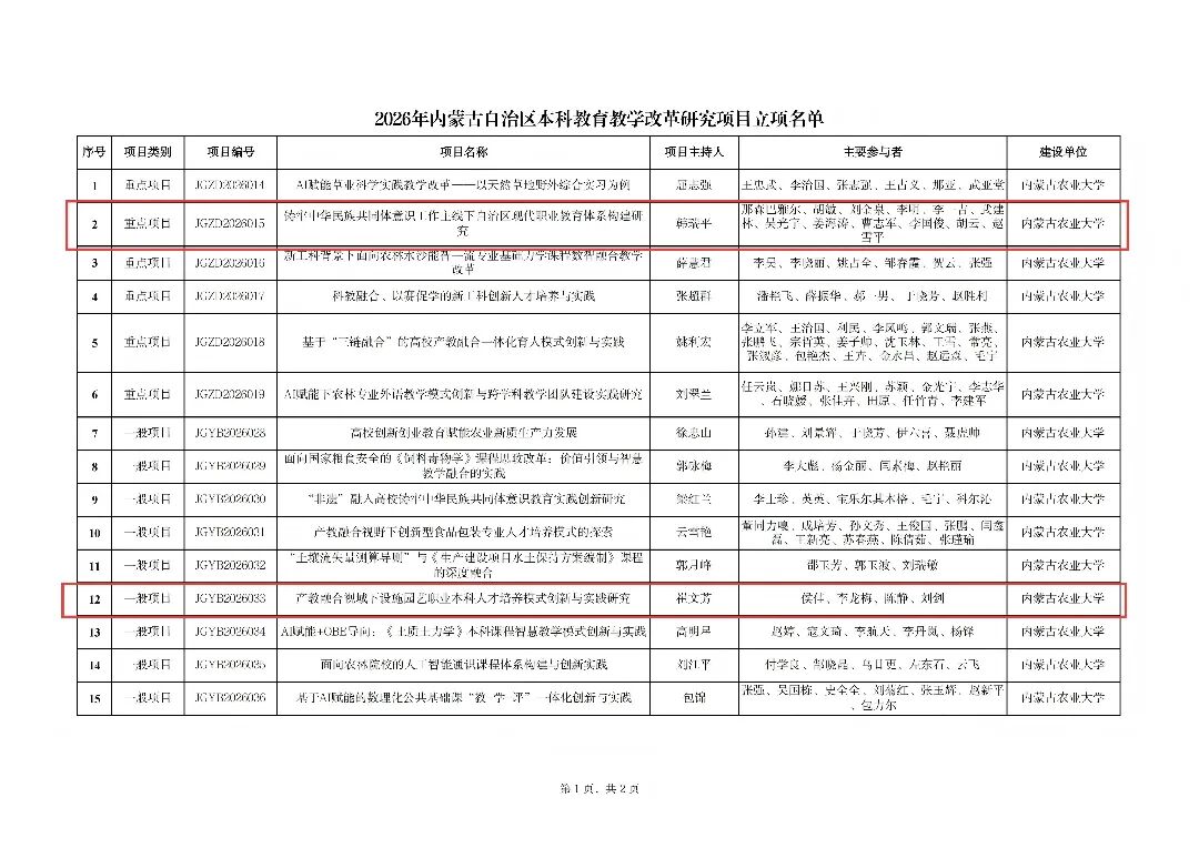 近日,自治区教育厅公布了本科教育教学改革研究项目立项结果,由校党委委员、学院党委书记韩瑞平主持申报的《铸牢中华民族共同体意识工作主线下自治区现代职业教育体系构建研究》获批重点项目,园艺园林技术系教师崔文芳教授主持申报的《产教融合视域下设施园艺职业本科人才培养模式创新与实践研究》获批一般项目。
