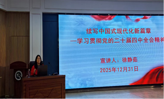 为深入学习贯彻党的二十届四中全会精神,推动全会精神落地生根,12月31日,机关第三党总支举行学习贯彻党的二十届四中全会精神专题宣讲会,特邀马克思主义学院教师徐静茹作专题讲座。会议由机关第三党总支书记陈广顺主持。