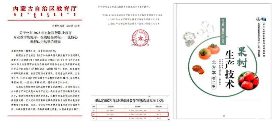 在“金课”与“金教材”建设方面,成果显著。累计建成自治区级一流课程1门、精品在线课程2门、劳动美育特色课程1门,培育校级一流课程2门,2门课程获学院课程建设优秀奖,1门课程获评院级课程思政示范课。丰富的专业课课程资源,显著提升学生专业素养与综合能力,在学院2024年举行的教学表彰大会上,2门课程获得“课程建设优秀奖”。建设期内,教师联合农业林业科学研究院及农业企业组建混合教材建设团队,参与编写出版农业类专业教材5部。其中,《农业推广技术》入选高等职业教育“十四五”规划教材,《果树生产技术》获评职业教育国家规划教材及农业农村部规划教材,《植物组织培养教程》被认定为产教融合新形态教材。