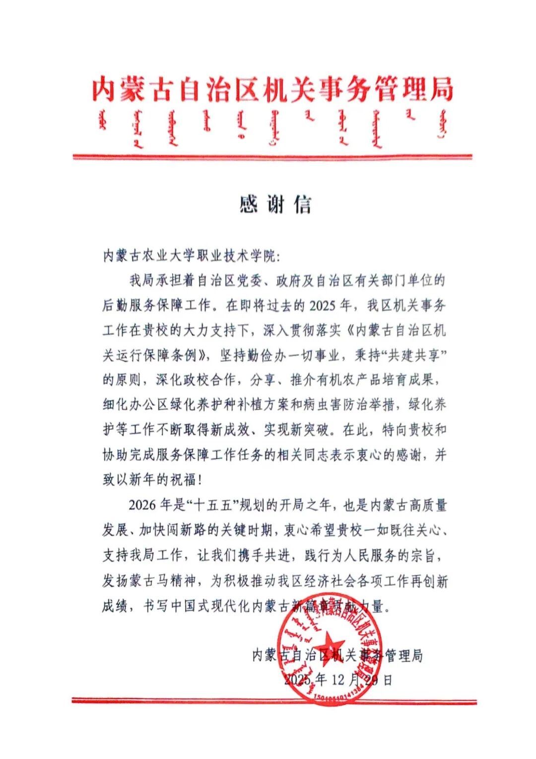 近日,学院收到内蒙古自治区机关事务管理局发来的感谢信,对我院在2025年度为自治区党政机关绿化养护及后勤服务保障工作中作出的突出贡献给予高度评价。