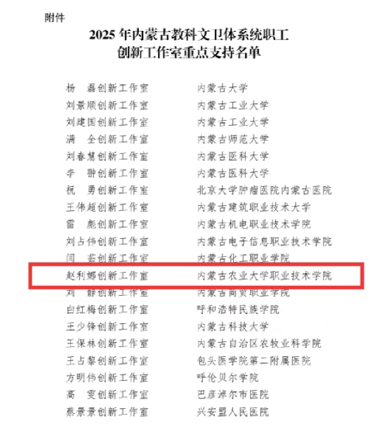 近日,内蒙古自治区教科文卫体工会印发《关于内蒙古自治区教科文卫体系统2025年重点支持的职工创新工作室的通报》(内教科文卫体工发〔2025〕31号),我院赵利娜创新工作室凭借扎实的创新基础、突出的技术优势和良好的发展潜力,成功入选2025年自治区教科文卫体系统重点支持职工创新工作室名单,获自治区专项支持资金2万元。