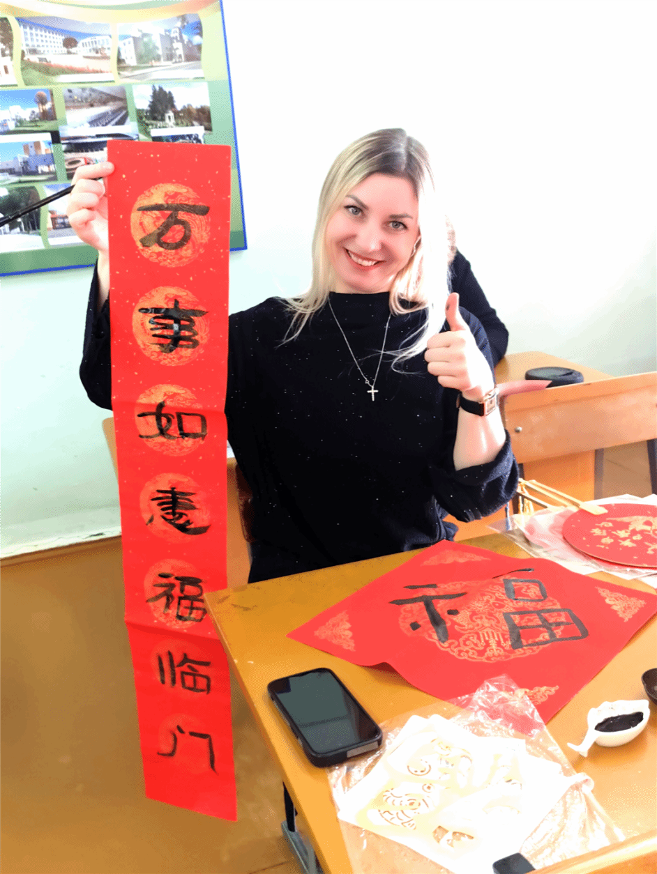拓印体验的意犹未尽之余,春联书写环节将现场氛围推向高潮。大家铺展大红宣纸,挥毫泼墨、笔走龙蛇,“一帆风顺吉星到,福照家门万事兴”“四季平安迎新春,八方鸿运贺佳年”,一副副饱含美好祝愿的春联,一个个寓意吉祥的“福”字跃然纸上,红底黑字的喜庆瞬间填满整个教室。书写间隙,留学生们还向白俄罗斯师生娓娓讲解春联的平仄对仗之美、贴春联的年俗传统,阐释“福”字寄寓的迎祥纳福美好期许,让白俄罗斯师生在欣赏书法艺术的同时,读懂中华年俗背后的文化内涵。不少白俄罗斯师生兴致盎然地拿起毛笔,在留学生“小老师”的悉心指导下,认真描摹笔画、学写汉字,一笔一划间,感受中国书法的独特韵味,亲手写下属于自己的“福”字与新春祝福,在墨香中结下跨文化的美好情谊。