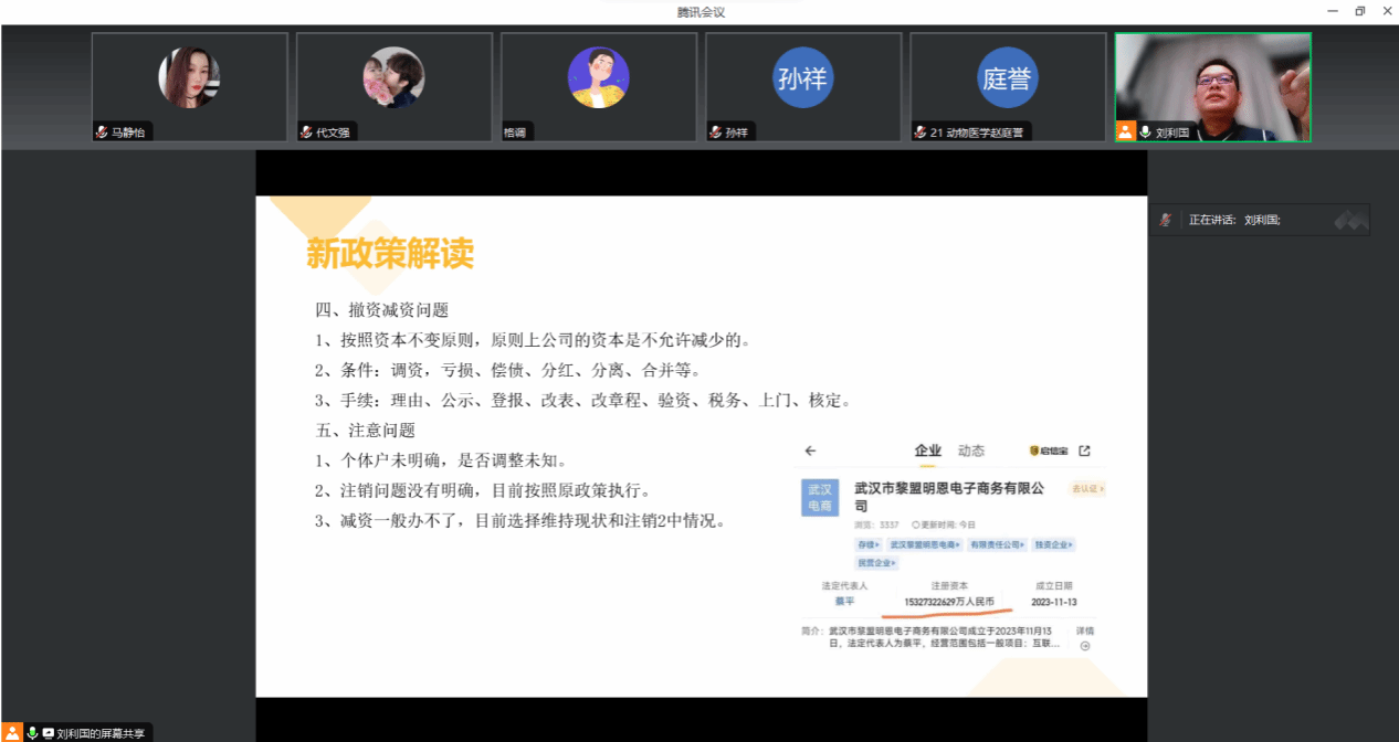 刘立国对学院创业园现有注册公司以及预计新注册项目情况进行通报,对新政策中的注册实缴问题、时间问题、撤资减资问题进行解读,并对创业公司的注册资金问题和注册注销问题给出宝贵建议。